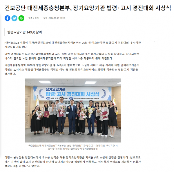 대전간호요양센터 고시 경진대회 우수상 수상!!! 페이지 정보 작성자 대전간호요양센터 작성일25-03-19 13:15 조회566회 댓글0건 관련링크 이전글 다음글 목록 본문 본 대전간호요양센터가 건강보험공단 대전세종충청본부에서 실시한 장기요양기관 법령, 고시 경진대회에서 우수상을 수상하였습니다!!! 이전글 다음글 목록